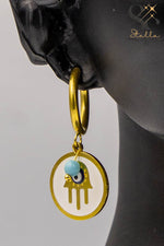 Metal Shape: Circular enamel with a hand design, featuring an eye and added beads