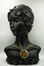 Pendant: The design features an Islamic religious shape consisting of a circular pendant inscribed with Ayat al-Kursi, adorned with an eye and white stones