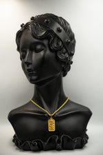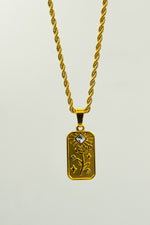 Pendant: The design features a rectangular frame with a flower and white zircon stones, accompanied by a braided chain