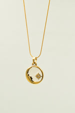 Pendant: The design features celestial shapes with a crescent and star with white stones inside a circular frame with a white enamel background