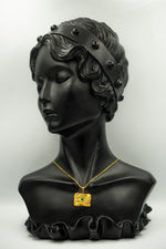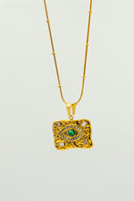 Design: The design features a pendant in the shape of an eye with a green stone, adorned with white stones, inside a square frame