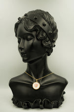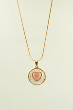 Pendant: The design features a heart shape with a pink stone on a white shell background in a circular frame